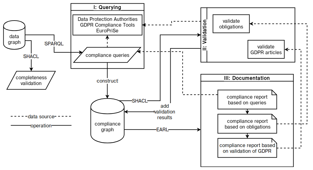 The information retrieved by the queries is relevant to the evaluation of compliance and therefore is saved in to a separate graph called compliance graph using SPARQL CONSTRUCT queries. The information within the compliance graph is linked to relevant obligations within the text of the GDPR using the GDPRtEXT ontology. Compliance validation is then performed using SHACL and the assessment is added to the graph. The purpose of this graph is to represent information relevant to compliance, to keep it separate from the data graph which may change with time, to capture a snapshot of the state of compliance, and to assist in the generation of compliance documentation.